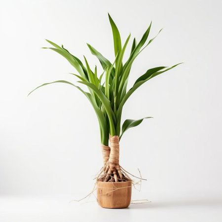 the ginger plant, with its slender stem and delicate leaves, takes center stage against a crisp white background, showcasing its natural beauty in a stunning monochrome setting, perfect for botanical enthusiasts and fans of minimalist design. ai generated