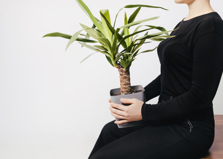 Plant care Photo template with copy space Girl is sitting with tropical tree in gray pot on her knees