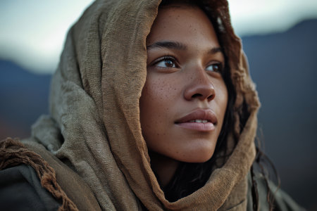 A person with a serene expression is wrapped in a textured, earthy-toned shawl, gazing thoughtfully into the distance. The soft lighting highlights their freckled complexion