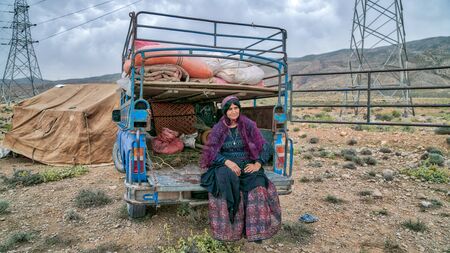 Shiraz, Iran - May 2019: Qashqai nomadic woman sitting at the back of her old car. The Qasqhai are nomadic people living in temporary villages.