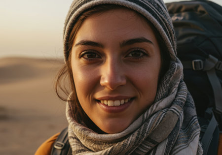 A woman with deep, thoughtful eyes is seen in a desert setting. Her scarf wraps around her head, creating an intriguing contrast with the warm light of sunset, highlighting her features beautifully.