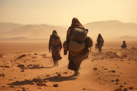 Hiker caught in a desert sandstorm, covering face with a scarf and struggling to move forward with swirling sand, extreme weather