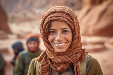 Portrait of a group of multi ethnic Muslim people in the ancient city of Petra, Jordan