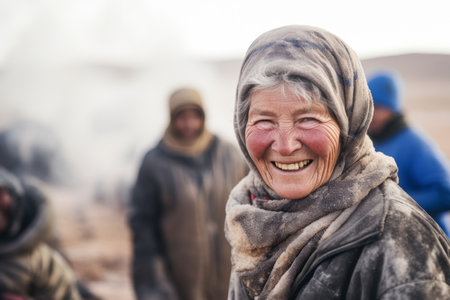 A mature Tajik woman 75 years old, gazes directly showcasing intricate traditional attire, rich cultural heritage of her nationality, evoking wisdom and grace. Brunette woman, wearing a headscarf. AI
