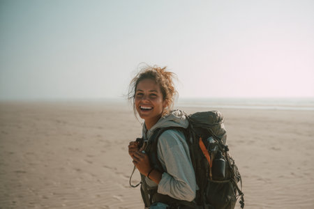 A backpacker enjoys a moment on the beach, dancing joyfully while wearing a backpack. The soft light highlights the cheerful expression as they look straight ahead.