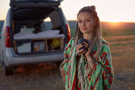 a young hippie woman stands in a field at sunset and mysteriously looks into the camera. High quality photo