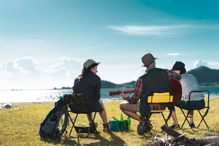 Camping group of friends asian people together, teenagers travel with backpack,tent man playing guitar song relaxing on vacation time holiday sitting on chairs near river and mountain view.