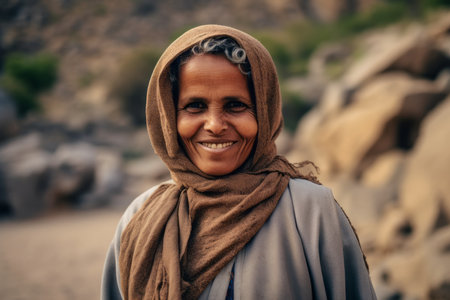 A joyful woman 45 years old from Afghanistan displays a bright smile while wearing traditional clothing. She stands confidently, embodying a sense of peace in her rural community. Generative AI.