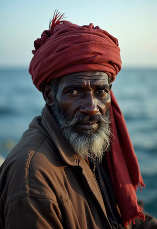 A Somali man dressed in traditional attire stands confidently on a beach with the ocean waves behind him. His expression conveys strength and determination, capturing the essence of modern piracy. AI.