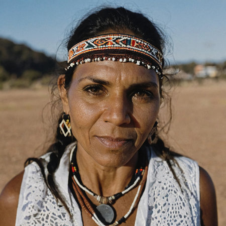 An Aboriginal Australian woman stands confidently, adorned in traditional attire and accessories.