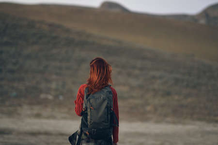 red-haired traveler with a backpack looks back on the nature in the mountains