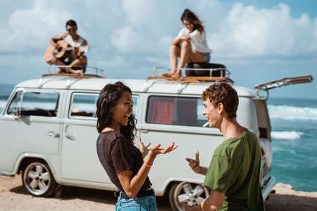 Happy multiracial friends having fun together on the beach, playing cards, laughing. Mixed race people friendship concept. Multi ethnic couple lifestyle.