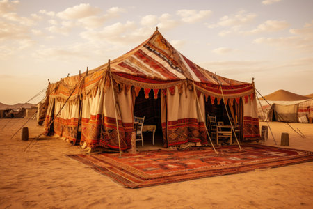 a beautiful view of a tent on the beach, Arabian traditional tent showcasing Arab heritage found in Saudi Arabia Desert, AI Generated