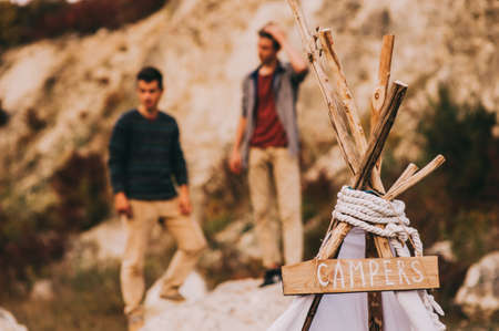 Close up of the top of a wigwam with the inscription no the board campers on the background of guys.