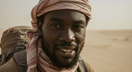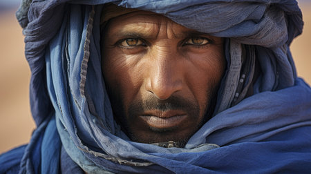 Portrait of a handsome Indian man wearing a scarf in the desert.