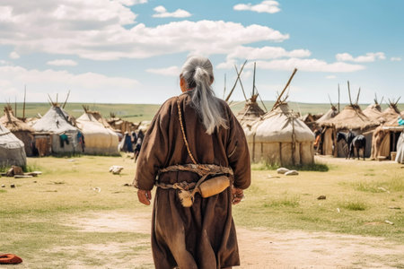 Mongolian ancient senior woman. Yurta house. Generate AI