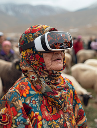 Portrait of an old woman wearing a virtual reality headset in Ladakh, India.