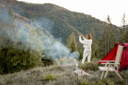 Young woman takes photo of beautiful mountain range, standing by the campfire at campsite with tent