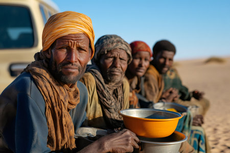 Group of nomads holding bowls and waiting for food distribution in a desert area