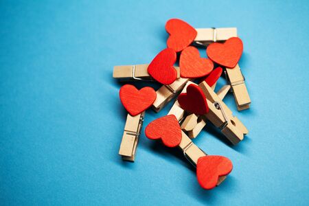 Wooden hearts on blue background. Happy Valentines Day. 14 February greeting card