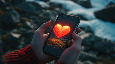 Person holding smartphone with heart icon on screen, blending with scenic mountain background.