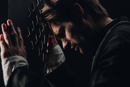 young tense catholic priest with closed eyes leaning on confessional grille in dark with rays of light