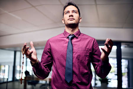 The crucifix is in the hands of a man who is praying for the blessing of his god with faith.