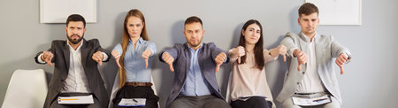 Dissatisfied group showing thumb down, unhappy young people dislike service, not recommending or advice company, not content or happy with product, expressing lack of satisfaction, hate, unpleased