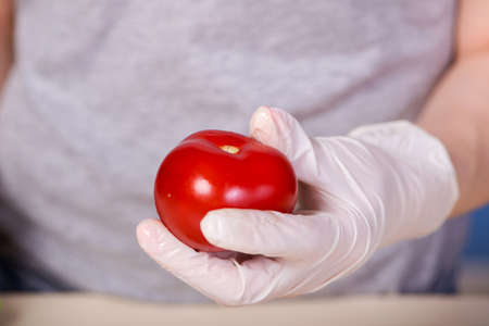 Injection for quick ripening tomato. Female biologist in blue gloves holds a syringe, close up. Genetically modified non organic food concept.