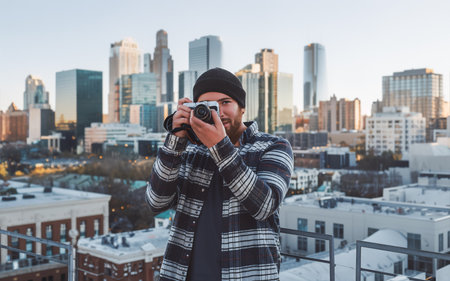 A photographer wearing winter attire and a beanie takes photos against the backdrop of Minneapolis's downtown skyline during sunset, creating a dynamic urban composition.