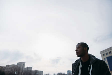 Thoughtful black male outdoors. Cloudy sky. White background with free space, urban style, rainy weather, fashion man model