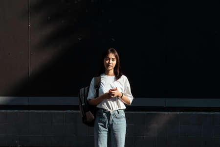 Thai girl standing infront of the wall, holding the smartphone, looking straight to the camera.