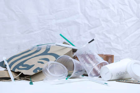 Phetchabun, Thailand - July, 15, 2017 : Plastic coffee mugs in the trash at Pino Latte Phetchabun, thailand.