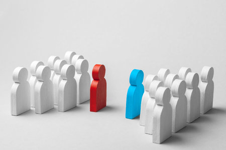 wooden figurines of men and one red on a blue background. Leader and recruiting concept. Toxic personality in the team
