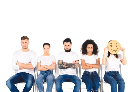 upset multicultural friends sitting on chairs with crossed arms while girl holding tricky sign isolated on white