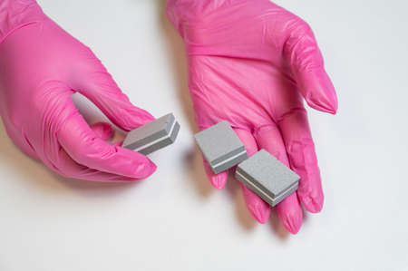 Empty containers for dental implants in the hands. Hands in gloves.The concept of installing dental implants. Modern dentistry.