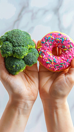 A person holds a donut in one hand and a piece of broccoli in the other hand, showcasing a clear choice between indulgence and nutrition.