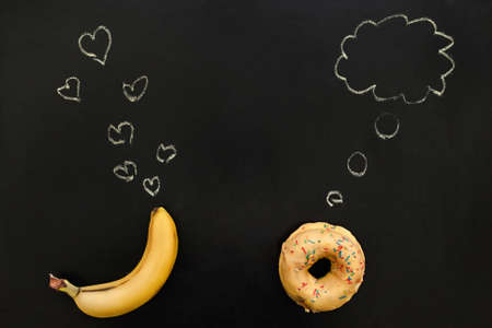 Pink doughnut and banana. Minimalism. Yellow banana wrapped in a centimeter tape. Located on the left, on a pale pink background. The view from the top. Space for text