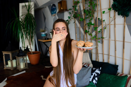Portrait of young beautiful woman in lingerie, black swimsuit with a sweet cake, croissant