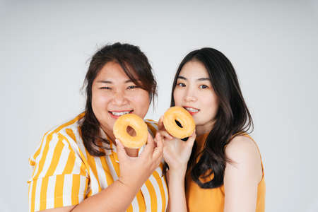 Two asian chubby and slim women holding unhealthy donut isolate over white background.