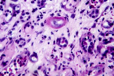 Ovarian cancer, light micrograph, photo under microscope. Photograph shows a fragment of a cancerous tumor in the female ovary. Selective focus