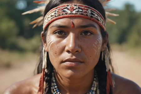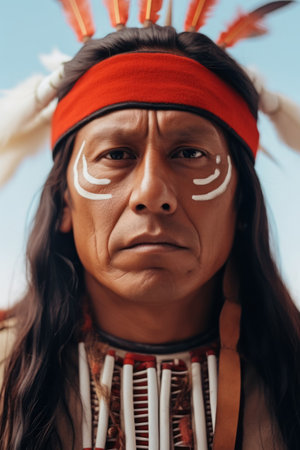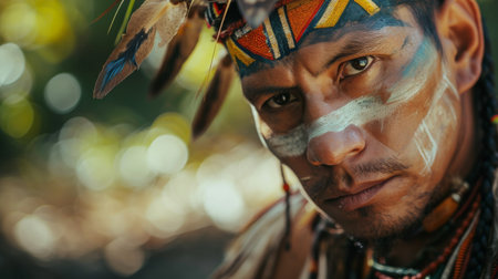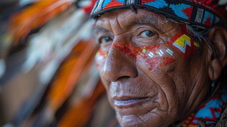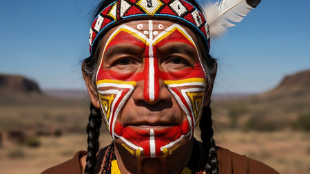 Close-up portrait of a Native American man with traditional face paint and headdress, showing cultural heritage. High quality photo