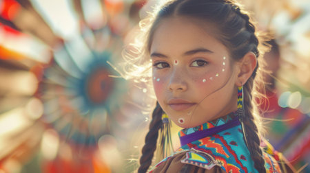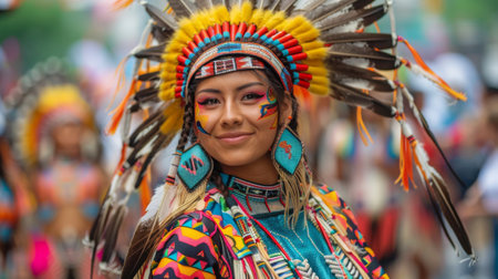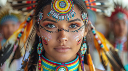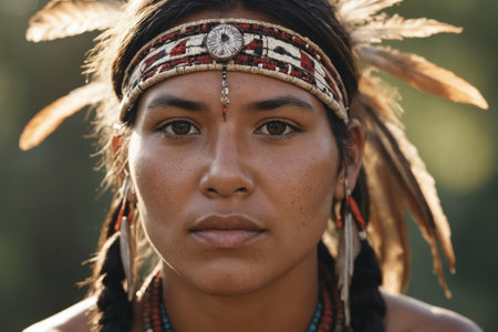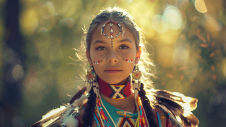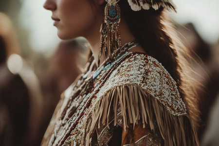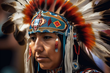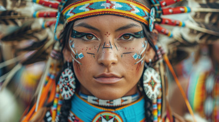 Close up of a young Native American woman showcasing traditional beaded attire and feather adornment, celebrating cultural heritage