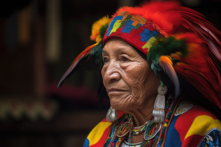 shot of a woman wearing traditional headgear that is decorated with parrot feathers, created with generative ai