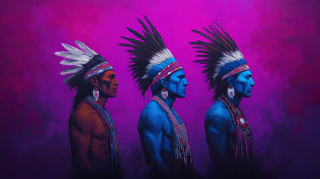 Three indigenous warriors stand in profile, showcasing vibrant body paint and feathered headdresses. The colorful background enhances their strong presence and cultural pride.