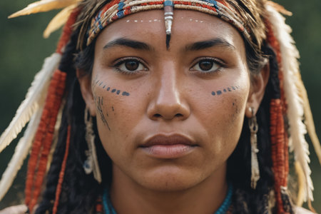 Portrait of beautiful indigenous tribe woman. Traditional Indian with painted faces. Native american people. Created with Generative AI
