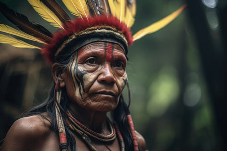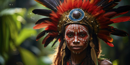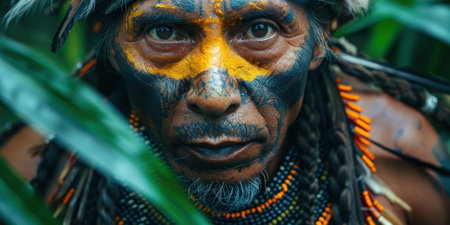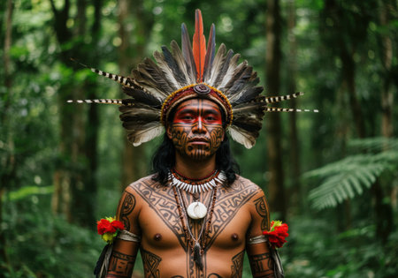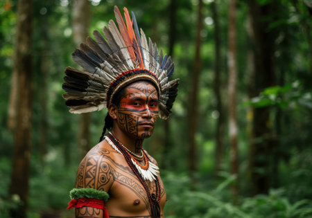 A proud indigenous warrior adorned with a vibrant feather headdress and body paint stands amidst the dense greenery of a tropical rainforest.