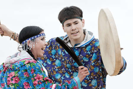 KAMCHATKA, RUSSIA - AUGUST 9, 2014: Woman and a man dancing with a tambourine. Public concert Koryak Folk Dance Ensemble Angt on the Khalaktyrsky Beach around City Petropavlovsk-Kamchatsky.