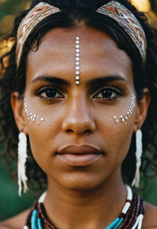 Embodying her heritage, a young Aboriginal Australian woman gazes confidently at the camera, showcasing intricate body art and vibrant accessories amidst a lush backdrop.