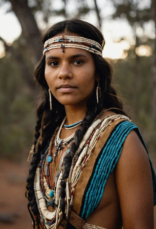 A young Aboriginal Australian woman stands gracefully in nature, proudly showcasing her intricate traditional attire that reflects her rich cultural heritage.